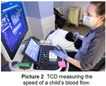 Children with sickle cell disease are at risk for stroke. Transcranial (trans-CRANE-ee-ul) Doppler (TCD) ultrasounds help predict that risk. A TCD measures how fast blood is flowing to the brain (Picture 1).