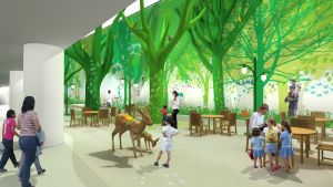 - The space connecting the new construction and the existing main hospital lobby will become the “Magic Forest” with a café, seating and a “seek-and-find” built into the walls. The Magic Forest will have large, fabricated trees and an ever changing light and soundscape to prompt the feeling of being inside a whimsical forest.