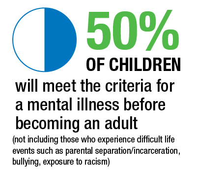 - 50% of children will meet the criteria for a mental illness before becoming an adult, not including those who experience difficult life events (such as parental separation/incarceration, bullying, exposure to racism)